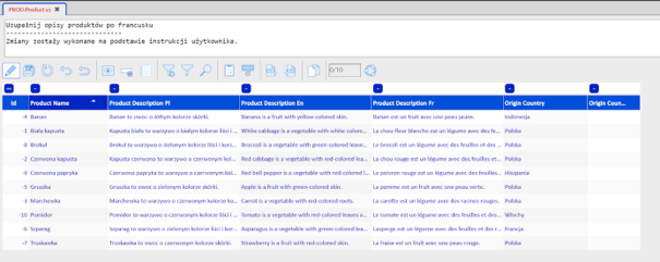Mamy bazę produktów z opisami i chcemy dodać tłumaczenia nazw i opisów produktów np. na język francuski. Obecnie musieliśmy wykonać żmudną i czasochłonną pracę, czyli rekord po rekordzie modyfikować dane: skopiować opis po polsku, wkleić do Google Translate, a następnie wkleić z powrotem wersję przetłumaczoną do tabeli w Metastudio DRM.